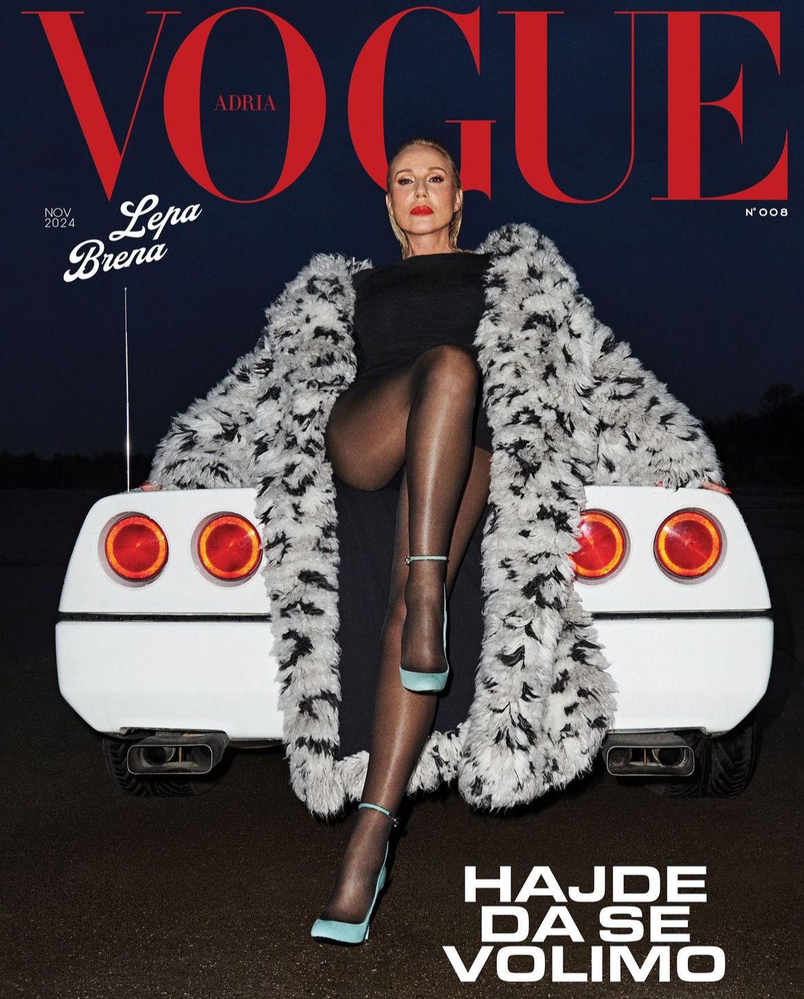 Liam: I had no idea Vogue Adria existed, and I don’t know Ms. Brena, but I’m living for this shot! The composition is stunning—she’s serving with that pose on the car, and the contrast of the dark sky against the red text is so sexy and elegant. Obsessed!